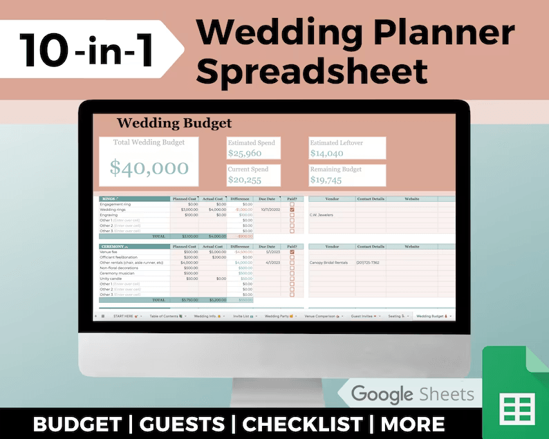 10-in-1 Wedding Spreadsheet - Online Budget Planner, Guest List Template Google Sheets Checklist, Expense Worksheet & Venue Comparison