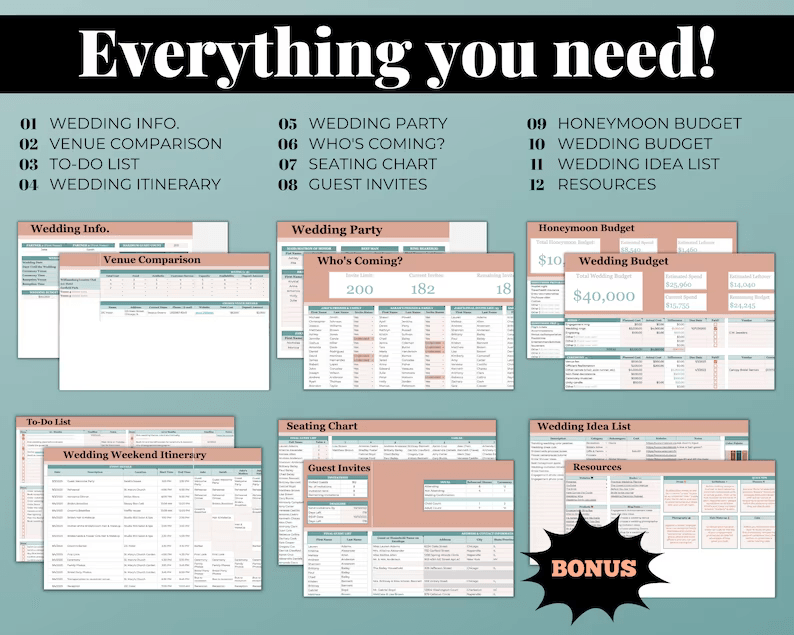 ✔️ Wedding AND Honeymoon Budget Spreadsheet ✔️ Wedding Guest List Template ✔️ To-Do Wedding Checklist ✔️ Wedding Planning Timeline Template ✔️ Venue Comparison Spreadsheet ✔️ Wedding Idea List ✔️ And more!